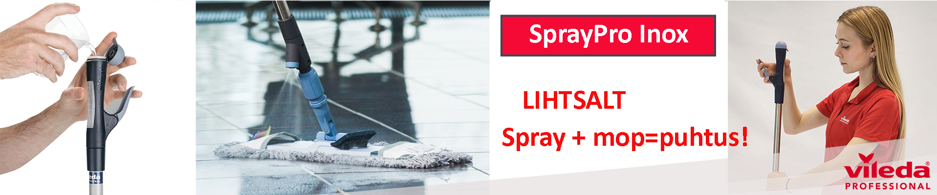 Vileda SprayPro Inox Spray+Mop=puhtus SprayPro Inox on professionaalne ja kasutusvalmis põrandapuhastussüsteem, mis sisaldab kõike, mida vajate ämbrita pesemiseks. Täitke lihtsalt...
