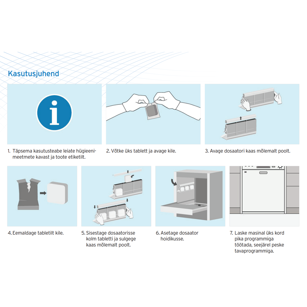 Ecolab Smartpower Mini nõudepesu-ja loputustabletid on ideaalne kaks-ühes kontsentreeritud nõudepesu-ja loputustabletid. Võtavad vähe ruumi ning optimeerivad kasutuskulusid. Suurepärane puhastusvõime ja plekieemaldus. Kasutamiseks pehme kuni keskmise karedusega vee korral eestlaetavates klaasi- ja nõudepesumasinates. Sobib enimlevinud materjalide pesemiseks nagu portselan, klaas, korduskasutatav plast, roostevaba teras jne. Ühest 24 tabletti sisaldavast karbist jätkub kuni 1200 pesutsükliks. Pole vaja eraldi vedelaid pesu-ja loputusvahendeid, mis välistab ainete segiajamise ohu. NTA-, EDTA-, kloori-, fosfaadi- ja fosfonaadivaba.